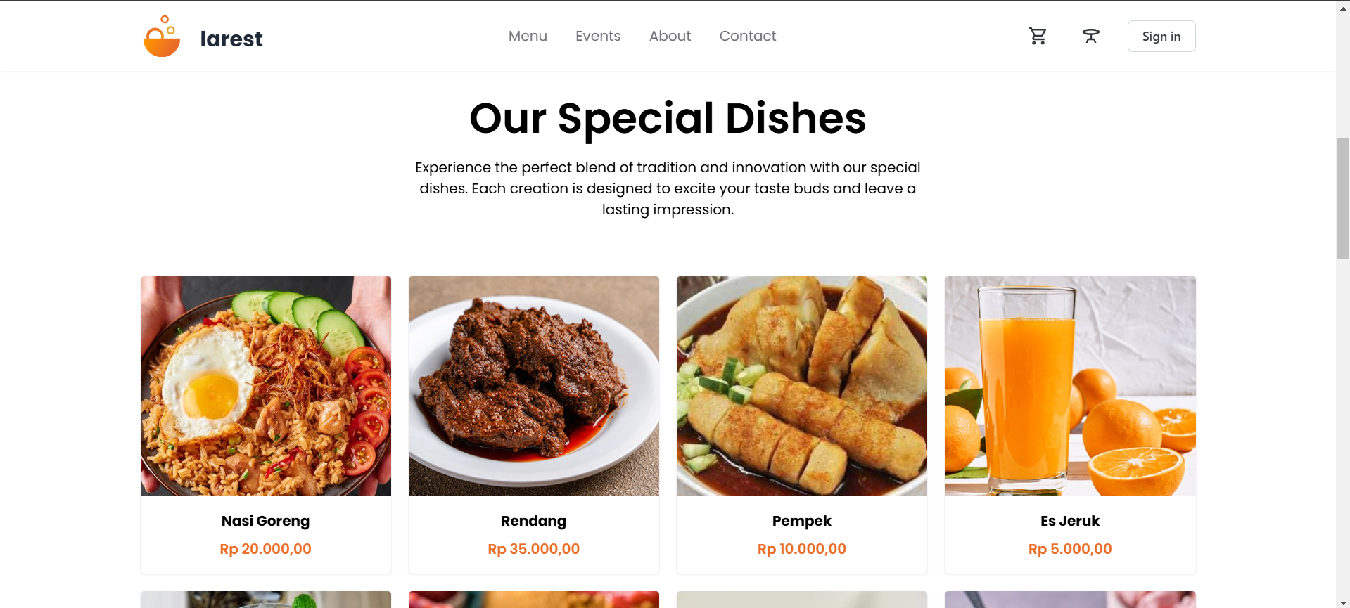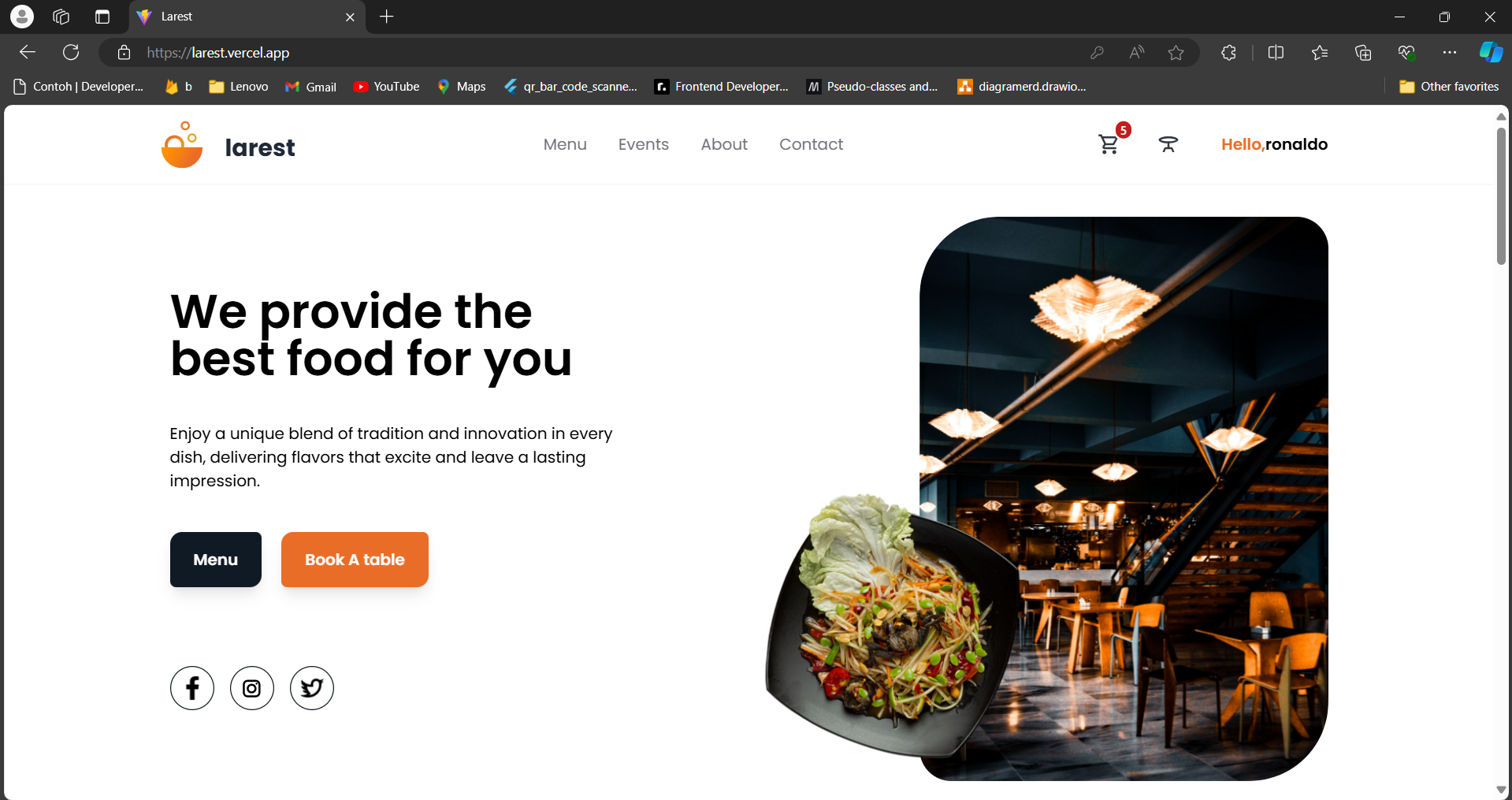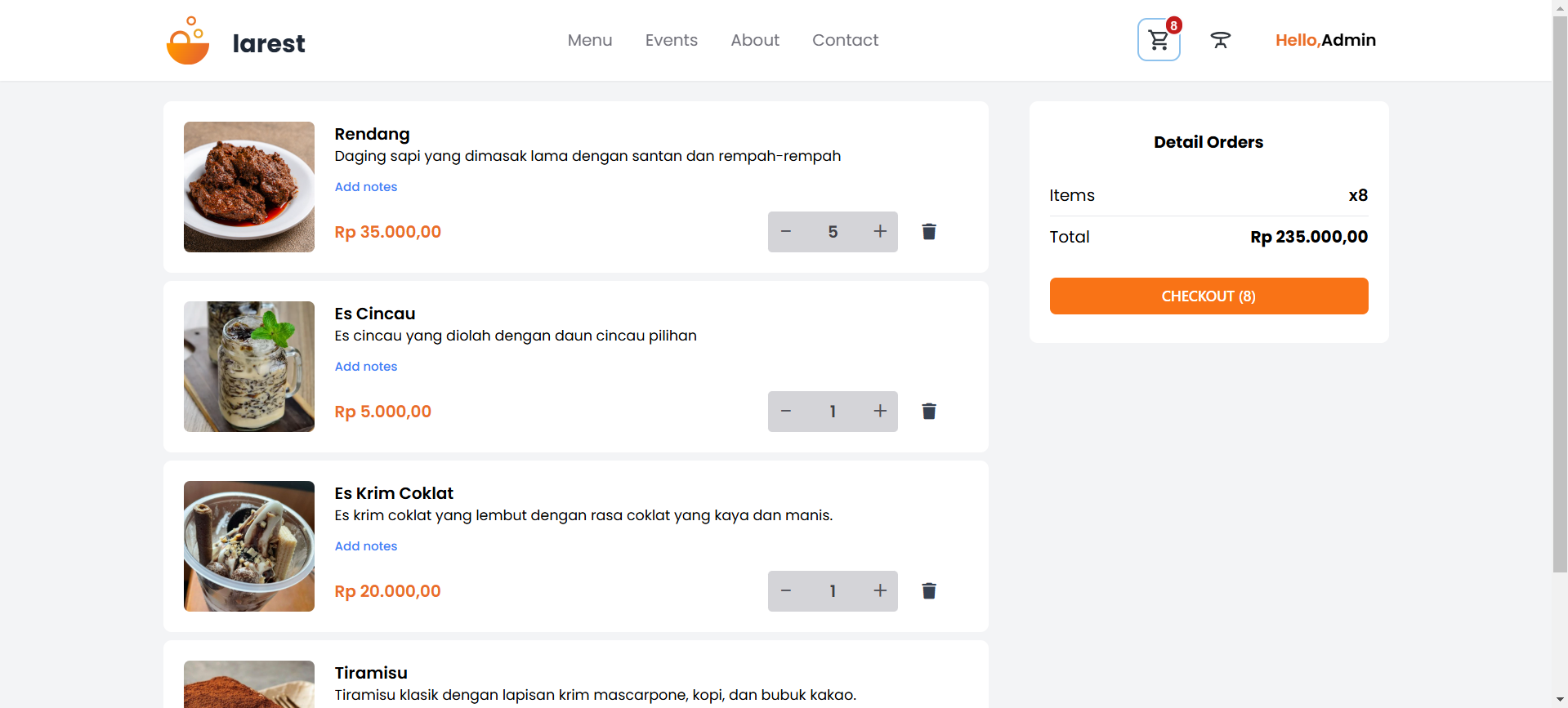 "Larest" is the name I chose for this application (Client version), which aims to digitize a restaurant experience. Through this app, customers can place orders directly, with features like cart, reservation, and online transactions intended to make ordering from home easier and more convenient.